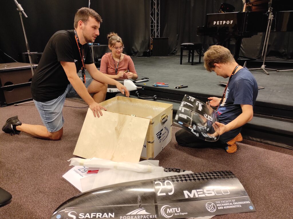 O przygotowaniach, zawodach i zdobytym doświadczeniu opowiedzieli Wojciech Koszelski, który odpowiadał za projekt samolotu, Justyna Rybak pomagająca przy projekcie samolotu oraz Michał Antonik, skarbnik Koła Naukowego Euroavia Rzeszów.