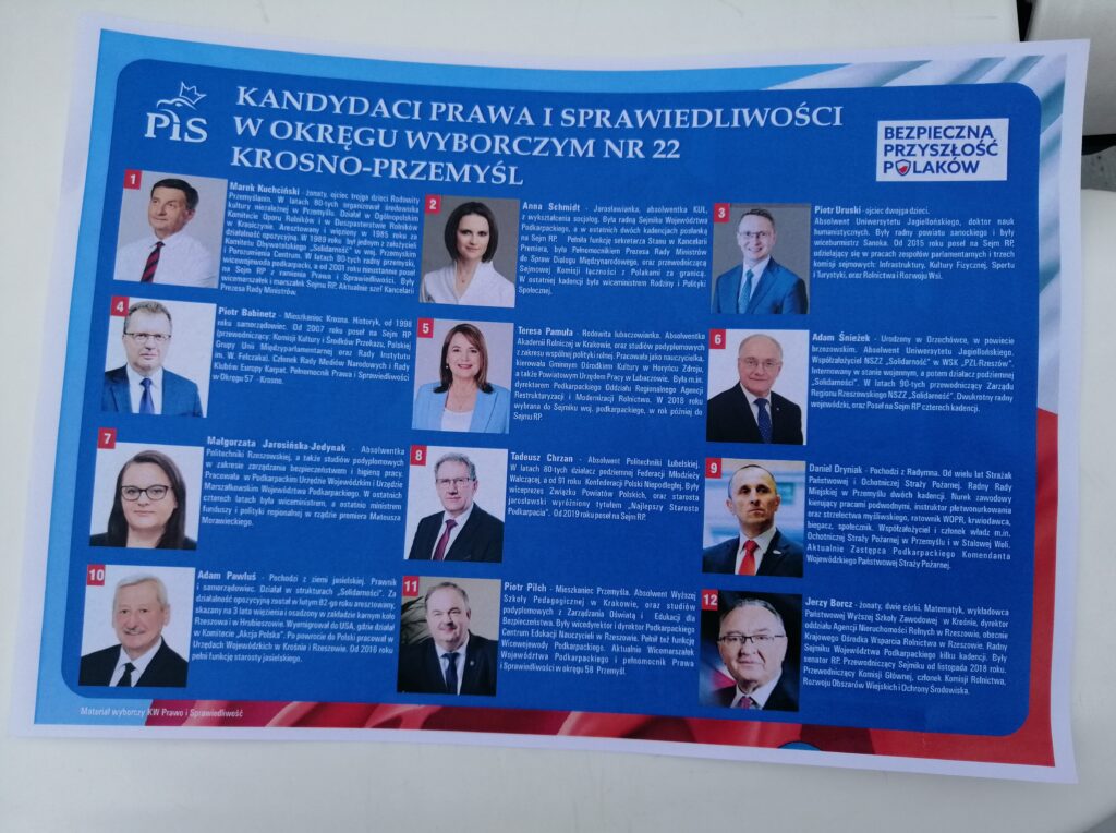 Prawo i Sprawiedliwość zaprezentowało dziś listy kandydatów z naszego regionu do parlamentu. W okręgu numer 23 – rzeszowsko-tarnobrzeskim – zgodnie z wcześniejszymi informacjami jedynką jest Zbigniew Ziobro. Na drugim miejscu znalazł się Krzysztof Sobolewski – poseł i Sekretarz Generalny PiS, a na trzecim wojewoda podkarpacki Ewa Leniart. Na kolejnych pozycjach znaleźli się wiceminister infrastruktury Rafał Weber, posłowie PiS tej kadencji Jan Warzecha i Zbigniew Chmielowiec, wicemarszałek Podkarpacia Ewa Draus, Jerzy Bednarz z NSZZ Rolników Indywidualnych, oraz posłowie tej kadencji Andrzej Szlachta, Fryderyk Kapinos, Jerzy Paul i Kazimierz Gołojuch. Na liście w okręgu numer 23 znaleźli się również m.in. była posłanka PiS Krystyna Wróblewska, wicemarszałek Podkarpacia Stanisław Kruczek, radny Sejmiku i historyk IPN Jacek Magdoń oraz dyrektor Departamentu Kultury Urzędu Marszałkowskiego w Rzeszowie Robert Godek. Z ostatniego miejsca na liście startuje wiceminister sprawiedliwości Marcin Warchoł. Łącznie do Sejmu z listy PiS w okręgu nr 23 kandyduje 30 osób.