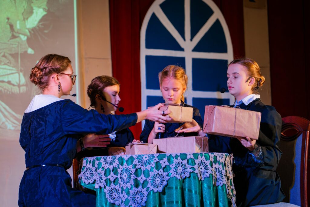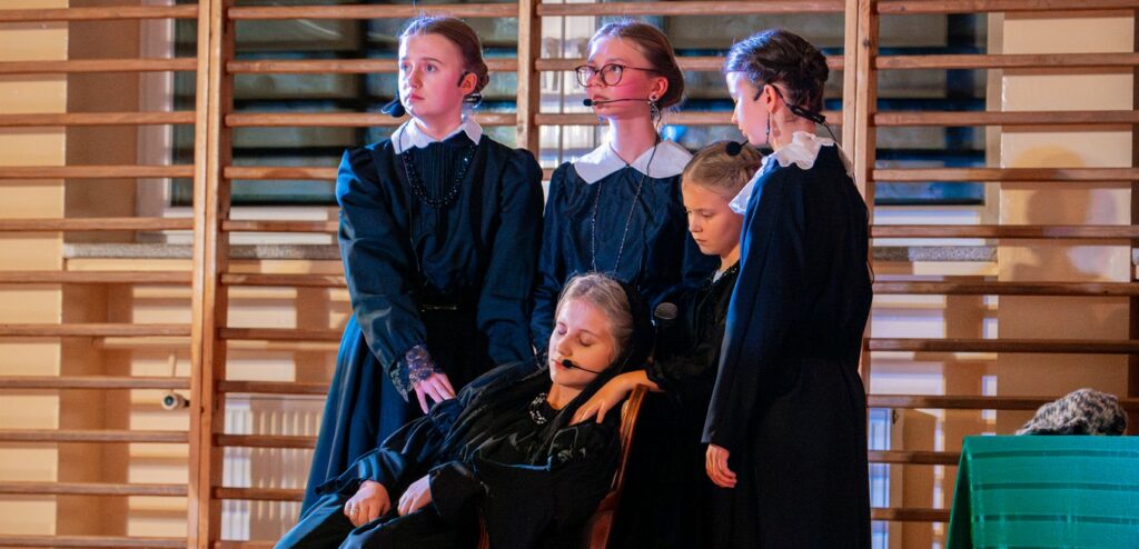 Był też czas na spektakl. Na scenie pojawili się młodzi aktorzy z klas 3b, 6a, 7a, 7b i 8a. Sztuka „A myśmy – wtedy – nie mogli być inni” jest historią niezwykłych kobiet walczących o wolność nie na polu bitwy, ale w swoich domach, w sąsiedztwach i małych ojczyznach.