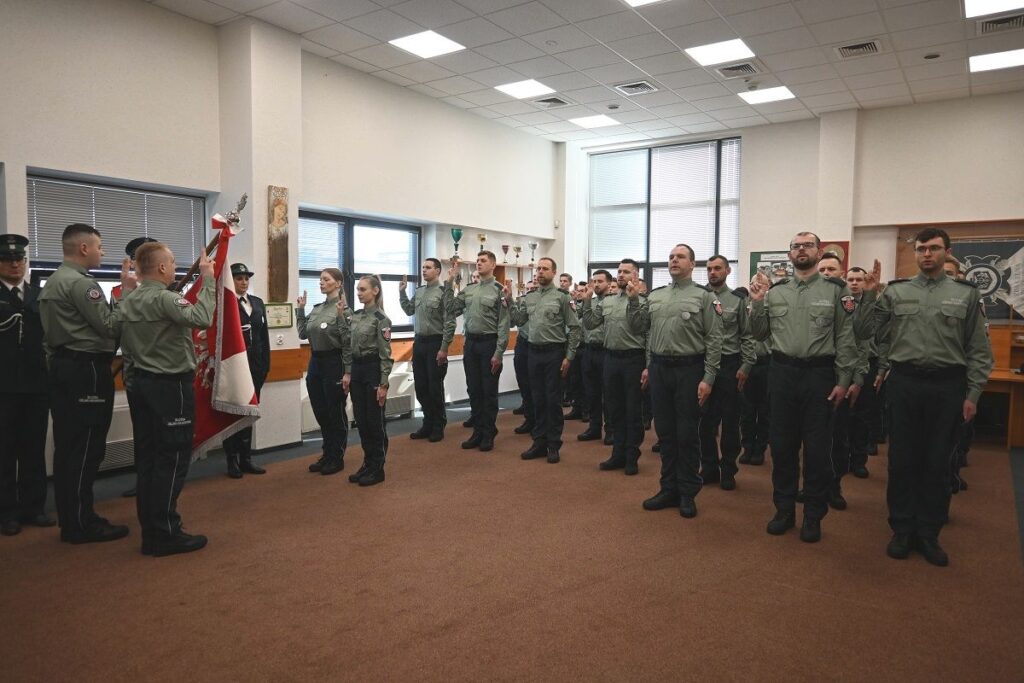 Nowo przyjęci funkcjonariusze Służby Celno-Skarbowej złożyli dziś uroczyste ślubowanie w Podkarpackim Urzędzie Celno-Skarbowym w Przemyślu. To 23 mężczyzn i 11 kobiet. Mają za sobą wieloetapowy proces rekrutacji, na który składały się m.in. test wiedzy, kompetencji, psychologiczny, sprawności fizycznej, rozmowa kwalifikacyjna.